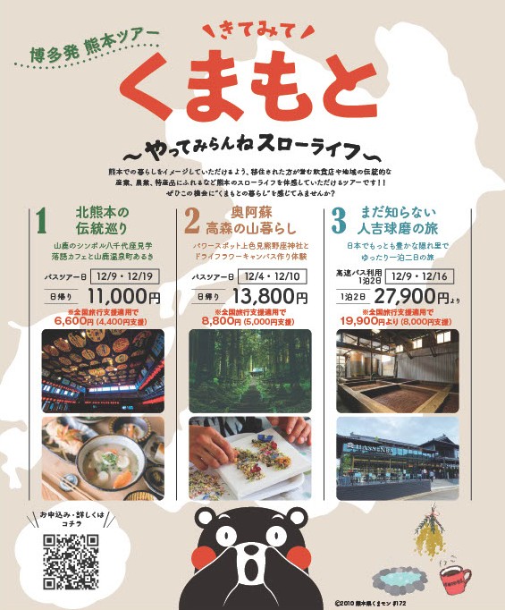 山鹿・阿蘇・人吉と3エリアごとに現地だからこそ楽しめる体験を盛り込んだツアーを開催。いずれもバスツアーで福岡発着にすることで、福岡市内を中心に福岡県にお住まいの方へ熊本暮らしを体験していただけるきっかけづくりをしました。現地での移住者の方とのお話や食やモノに実際に触れあえたのがよかったと参加者様からも感想をいただきました。これを機に熊本のファンになっていただけるツアーになりました。